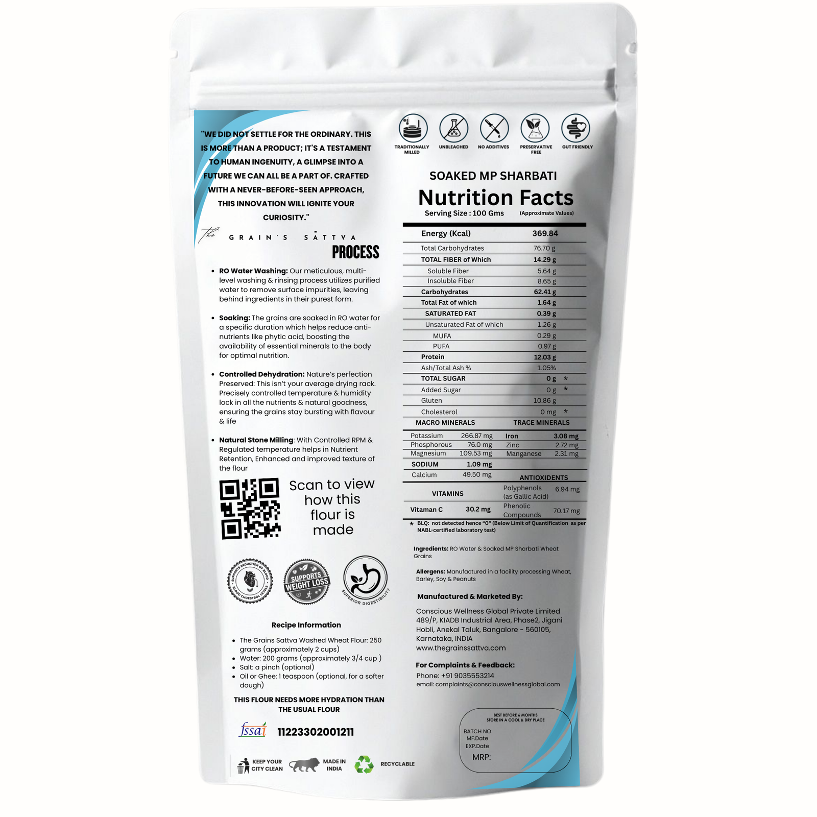 Experience the next level of purity and nutrition with our Activated MP Sharbati 306 Wheat Flour. Sourced from the finest MP Sharbati wheat grains, this flour undergoes a meticulous three-step purification process: RO water washing, precise soaking, and steam sterilization. This ensures superior quality and safety for your family’s everyday meals.