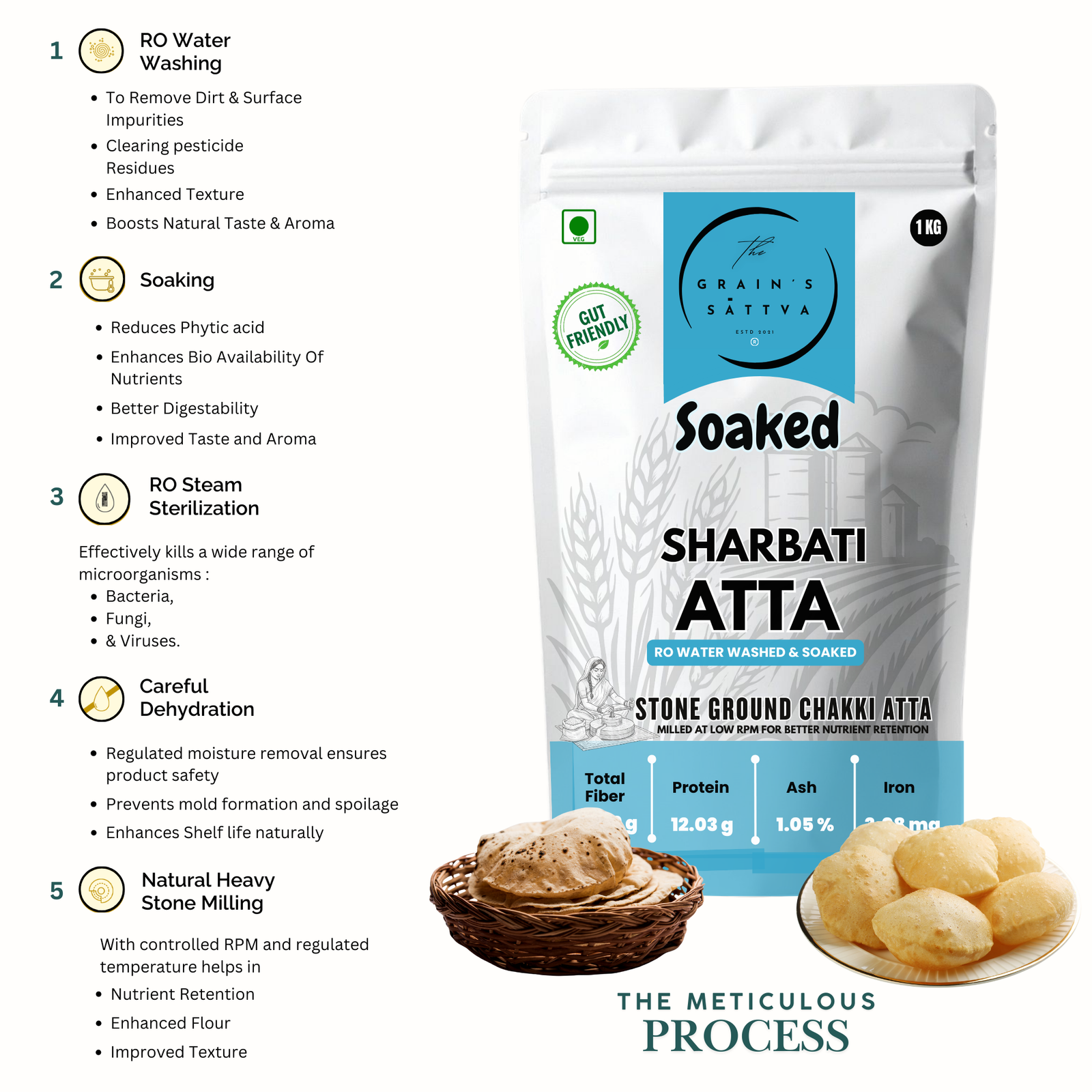 The final milling process utilizes traditional heavy stone grinding with controlled temperature and RPM, preserving the natural fiber, bran, germ, and nutrients. Our advanced facility, equipped with HEPA filters and air purification, guarantees freshness and purity in every batch.